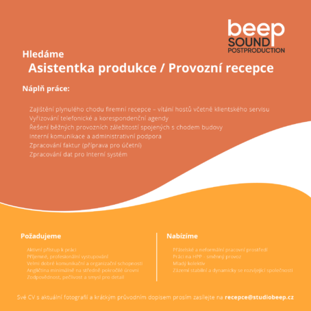 Zvukové postprodukční studio na Praze 7 hledá recepční/ho – asistenta/ku na HPP. Směnný provoz, nástup od října 2022.